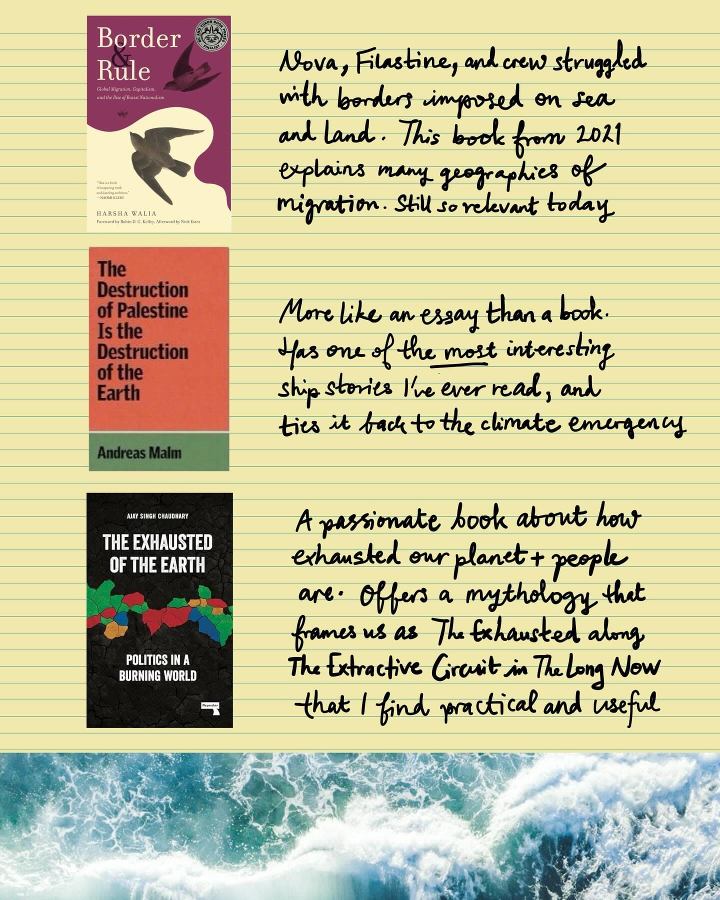 - Harsha Walia - Border & Rule: Global Migration, Capitalism, and the Rise of Racist Nationalism (2021) | Nova, Filastine, and their crew struggled with borders imposed on sea on land. This book from 2021 explains many geographies of migration and is still so relevant today.