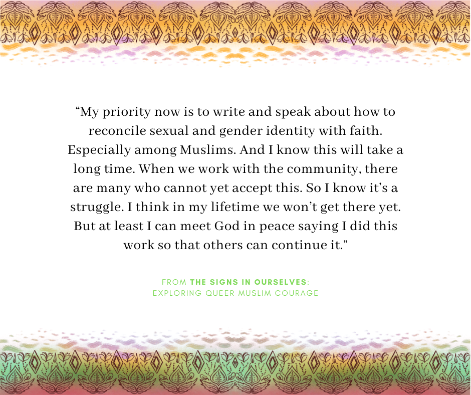 In inclusive spaces, she still could not talk about God, and her sense of disconnection continued. “It was like the opposite of the community back home. My LGBT friends were open to discussing almost everything, even sex positions and orgasms. But when I nominated a question about God for the discussion group, they said we can't talk about God here. I felt even more rejection and disconnection. Ten years ago, the LGBT community was not used to talking about reconciling Islam with sexuality. I needed to read more on my own because I could not discuss it with my friends.”