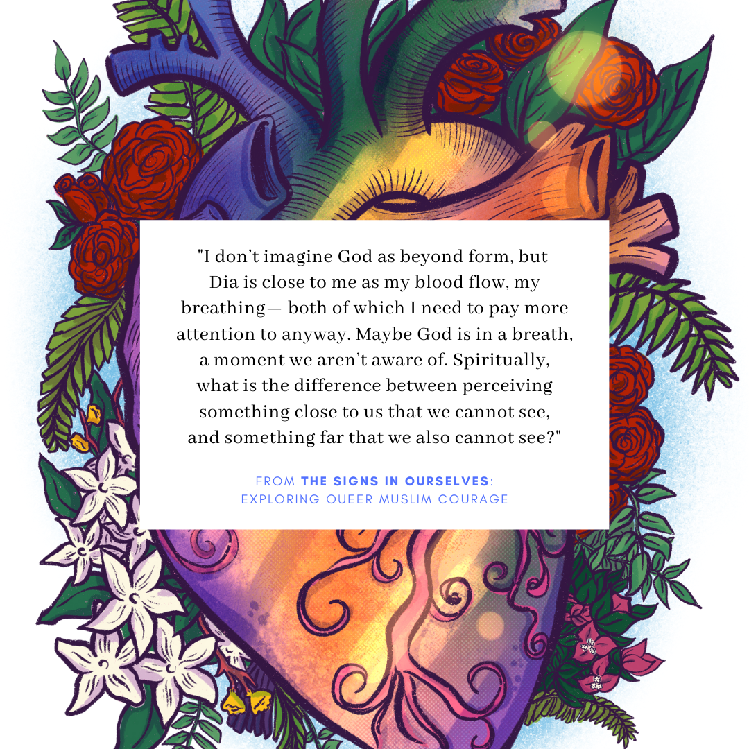 This is adapted from The Signs In Ourselves (pp. 1-7), a queer spiritual wellbeing workbook inspired by Qur'an verses 41:53, 51:20-21, and interviews with Southeast Asian Muslims. Written by Liy Yusof and illustrated by Dhiyanah Hassan, it was made available online in 2020 by the Coalition for Sexual & Bodily Rights in Muslim Societies with the support of Rima Athar. May Allahﷻ accept this offering and bring it to those who need it. Letters and inquiries: qmcourage [at] gmail [dot] com.