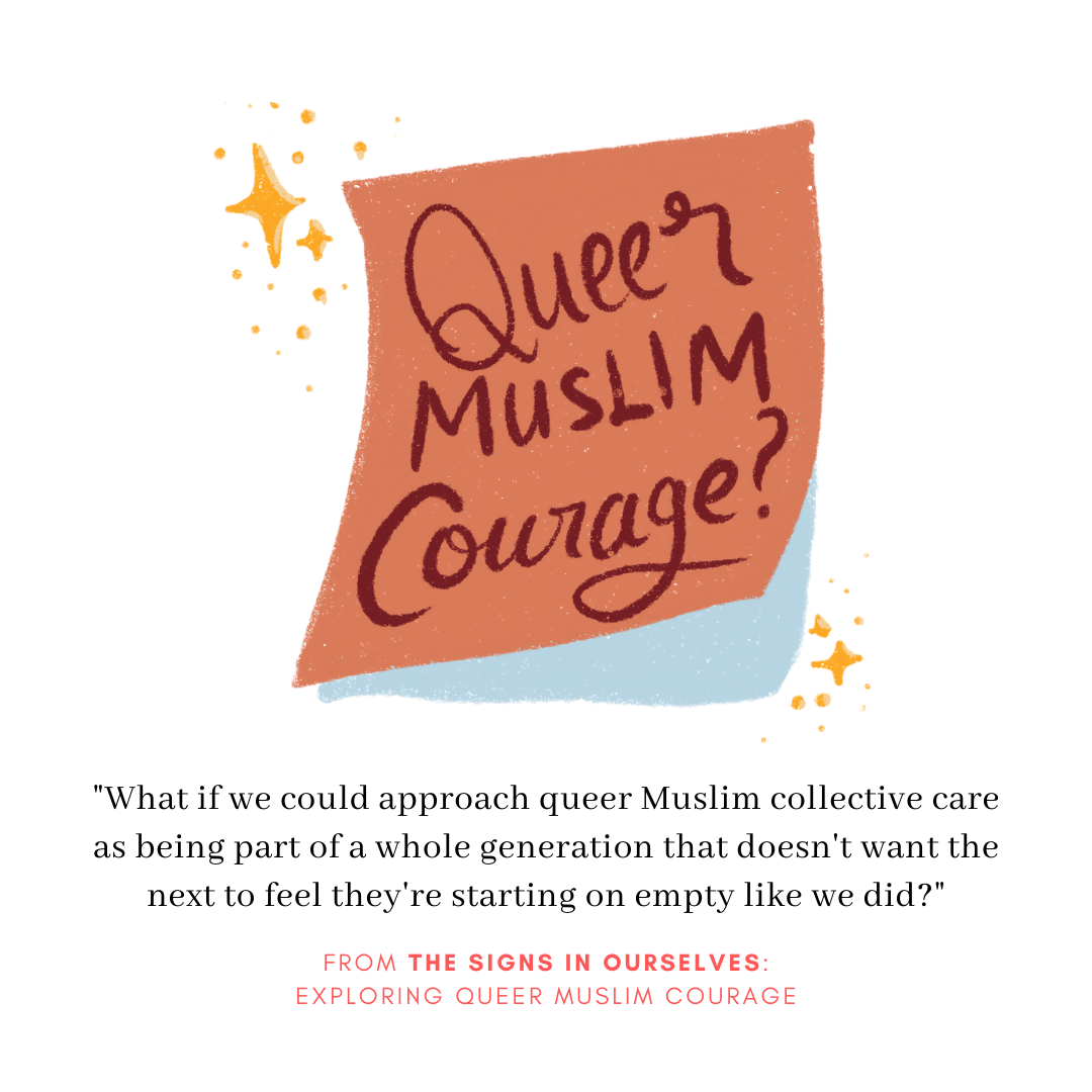The sub-title and theme of this book comes from a sticky note in my own writing that has stared back at me for two years: “Queer Muslim courage?” Like it was waiting for an answer. As I witness our resilience to find and make pockets of warmth away from pain, what comes up again and again for me is the idea of being a queer Muslim ancestor: What if we could approach queer Muslim collective care as being part of a whole generation that doesn’t want the next to feel they’re starting on empty like we did?