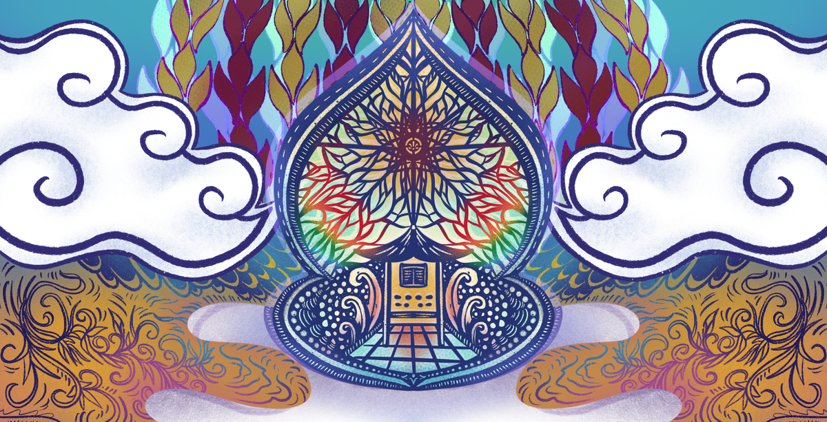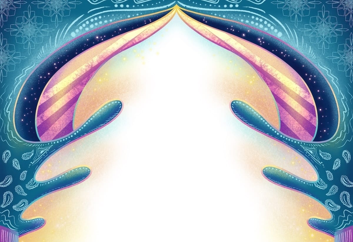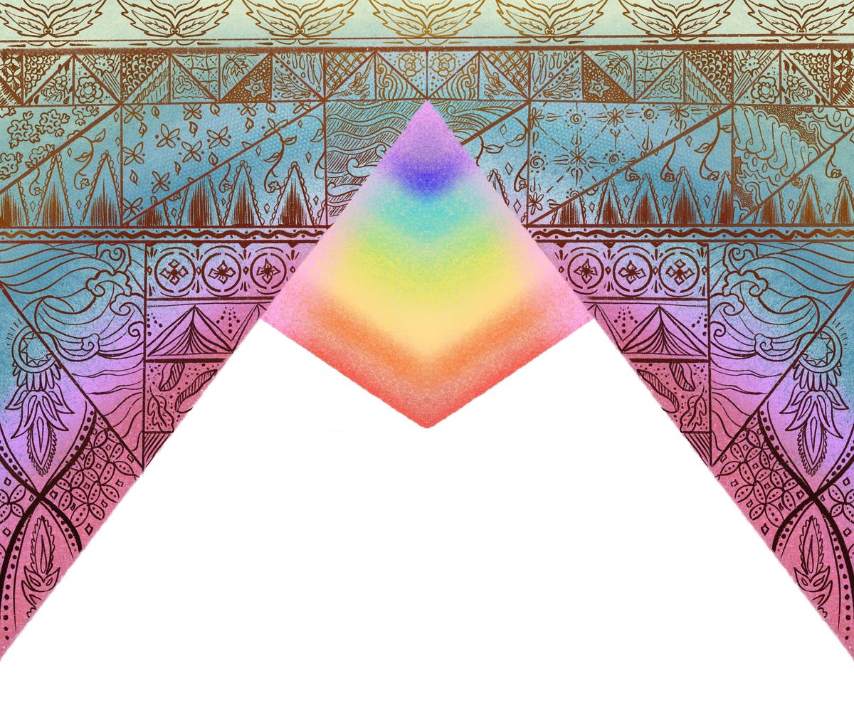 Every visual element you see in this series was digitally hand-drawn, including batik motifs, Qur'anic scripts featured in artwork, and patterns. Some elements have been inspired by references shared by participants of this project while others were derived from my research and personal explorations as a queer Muslim South and Southeast Asian artist. All portraits featured are intuitively imagined to maintain anonymity. The visual theme for this book echoes the Islamic five-times-a-day prayer ritual, signaling the Sun's movement through the sky. Each prayer time is expressed through the frames' colours and patterns on each page as the text flows like a river through them. Throughout the book, you'll find visual portals, echoes, and cues in the form of small and large illustrations that accompany the voices here.